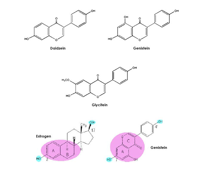 異黃酮的結構是不完全一樣的雌激素,使異黃酮是不雌激素。然而,異黃酮結構具有雌激素重要的相似之處。這些相似性允許異黃酮結合到在我們的雌激素應答細胞的雌激素受體